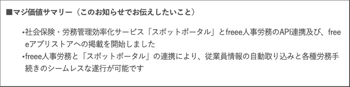 フリー株式会社(本社:東京都品川区、CEO:佐々木大輔)はスポット社労士くん社会保険労務士法人(本社:東京都千代田区、代表取締役:関根光)が提供する、社会保険・労務管理効率化サービス「スポットポータル」とfreee人事労務のAPI連携及び、freeeアプリストアへの掲載を開始したことをお知らせします。