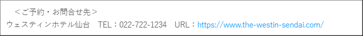 TEL:022-722-1234(代表) FAX:022-722-1270 E-mail:marketing@westin-sendai.com