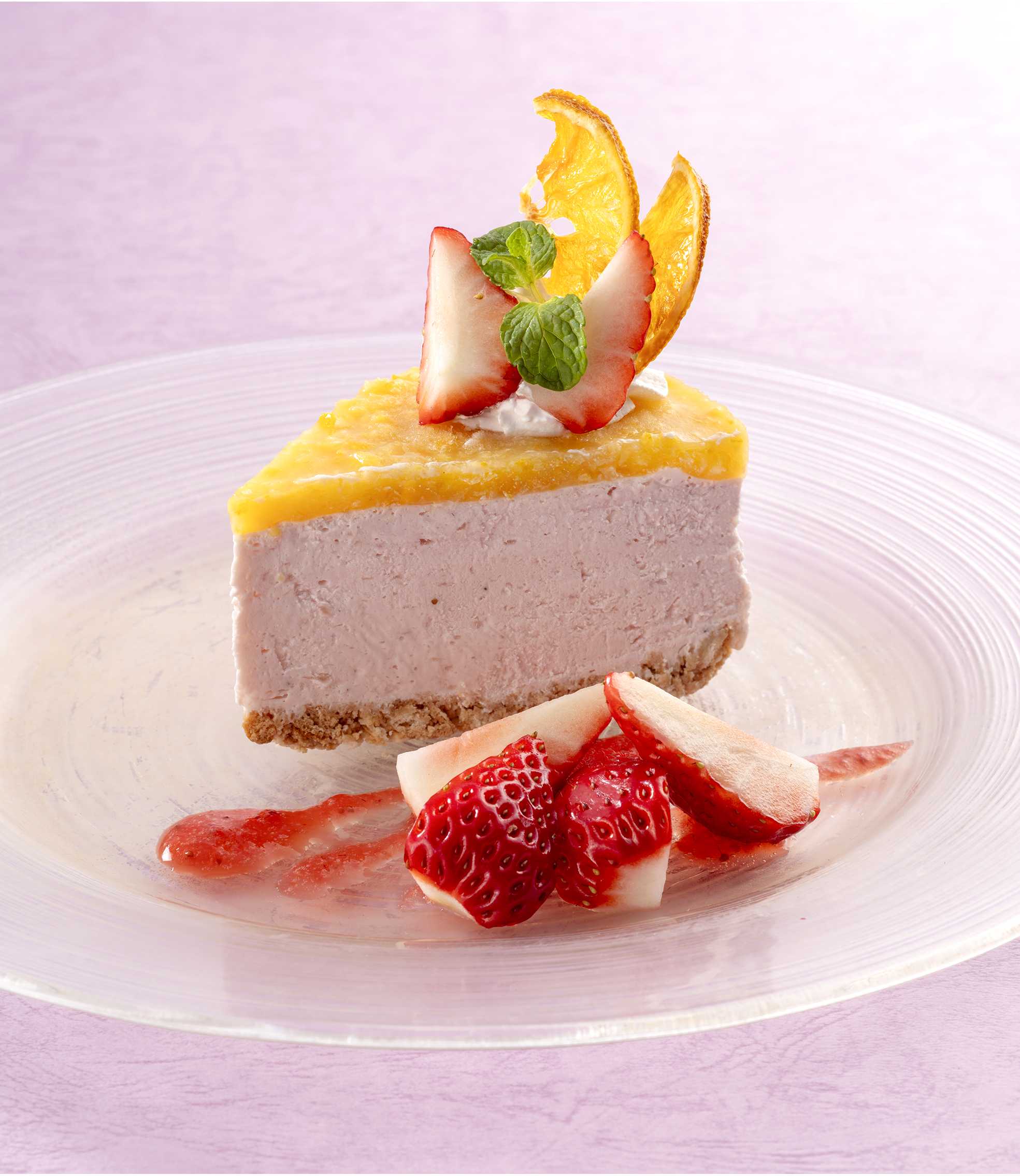 やさしい甘味のレアチーズと、“紅ほっぺ”と“はるひ”の甘酸っぱさと香りが相性抜群の爽やかなチーズケーキです。