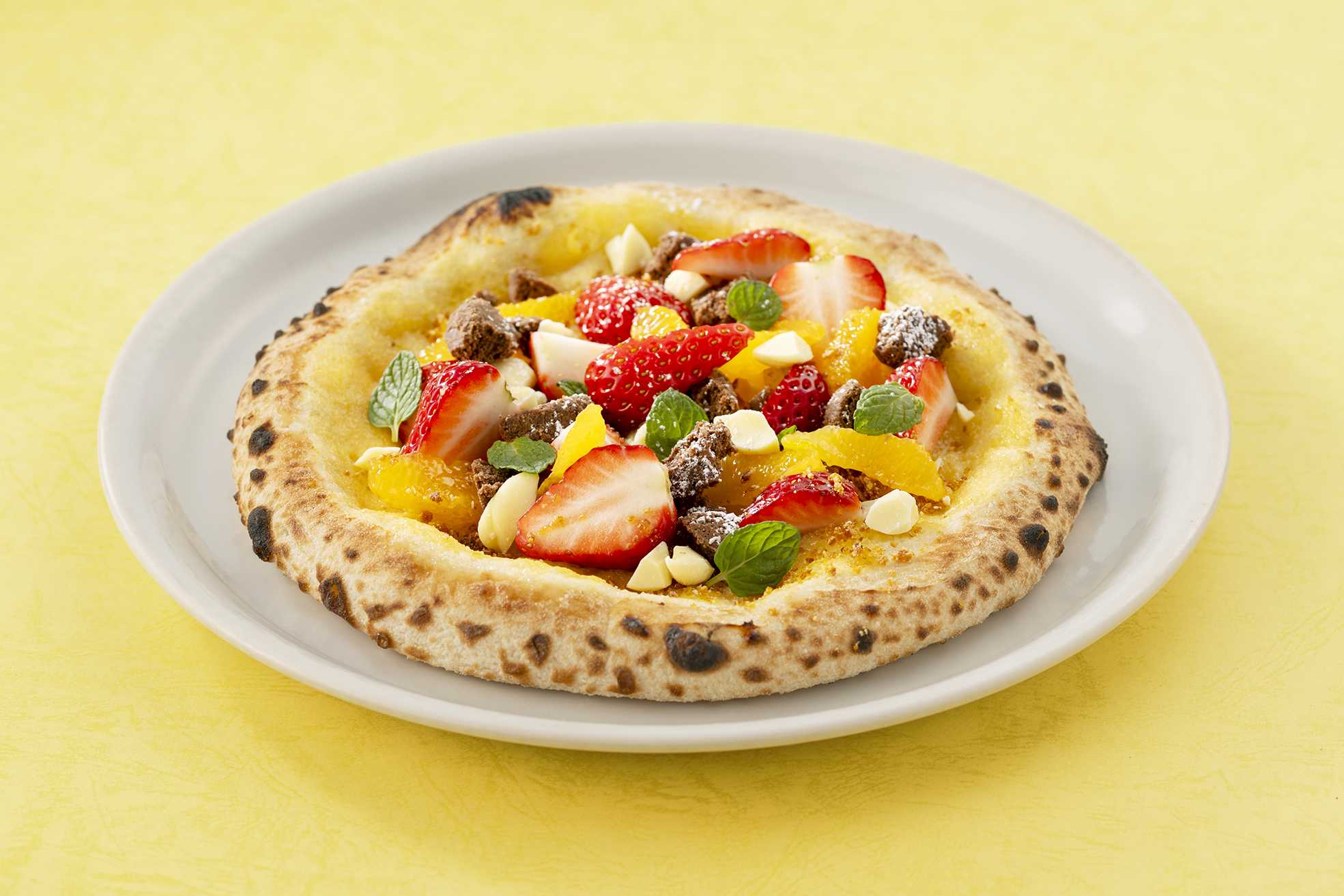 カスタードクリームとホワイトチョコレート、ココアクッキーをのせて焼き上げたピッツァに“紅ほっぺ”と“はるひ”を彩り仕上げました。