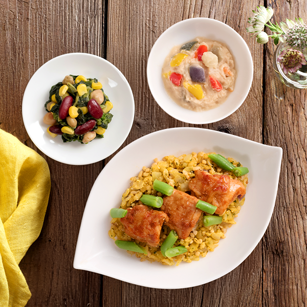 副菜には、ミックスビーンズとコーンの食感が楽しいほうれん草サラダと、隠し味にトマトドレッシングを加えた、後味さっぱりのポテトサラダを合わせました。
