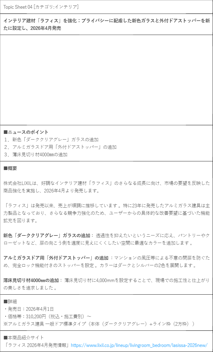 LIXILは、好調なインテリア建材「ラフィス」のさらなる成長に向け、市場の要望を反映した商品強化を実施し、2026年4月より発売します。