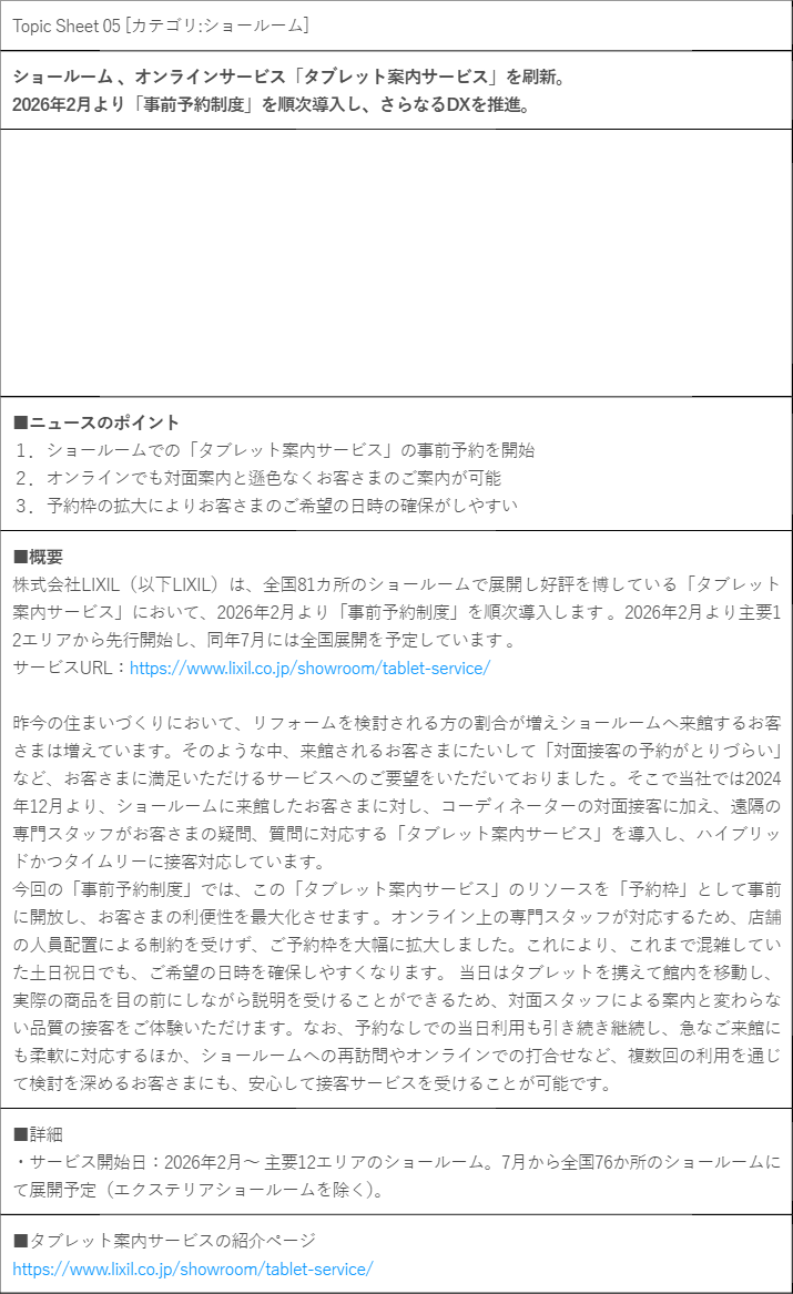 LIXILは、全国81カ所のショールームで展開し好評を博している「タブレット案内サービス」において、2026年2月より「事前予約制度」を順次導入します。