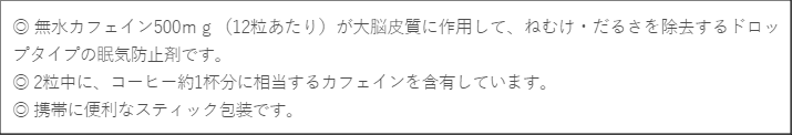 眠気防止薬は錠剤やドリンク剤が中心ですが、本製品は口中で溶かしながら服用するコーヒー風味のドロップタイプであり、2001年の発売以来、多くのご支持をいただいています。持ち運びやすいスティック包装なので、仕事、勉強、運転時など、ねむけやだるさが気になるシーンに合わせて服用いただけます。