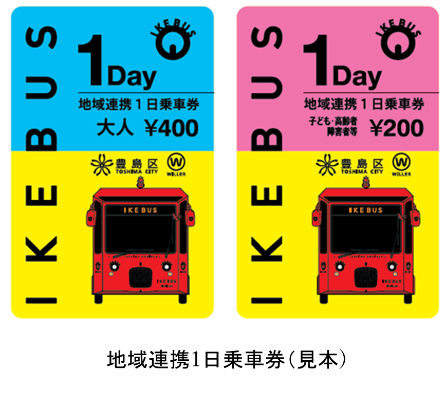 「地域連携1日乗車券」は、『IKEBUS』をより身近に利用しながら池袋のまちを周遊していただくことを目的に、地域のホテルや店舗、観光案内施設などと連携して販売するお得な乗車券です。通常の1日乗車券と比べ、「おとな」は100円、「こども・高齢者・障がい者」は50円お得な価格で購入いただけ、『IKEBUS』に乗って池袋周辺を1日中楽しむことができます。
