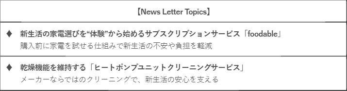 くらしアプライアンス社では、新生活を迎える生活者のこうした課題に寄り添い、くらしを無理なく整えていくためのサービスを展開しています。本ニュースレターでは、心地よく新生活を迎えるお手伝いができるサービスを改めて紹介します。