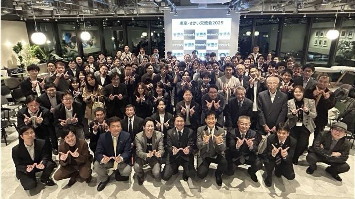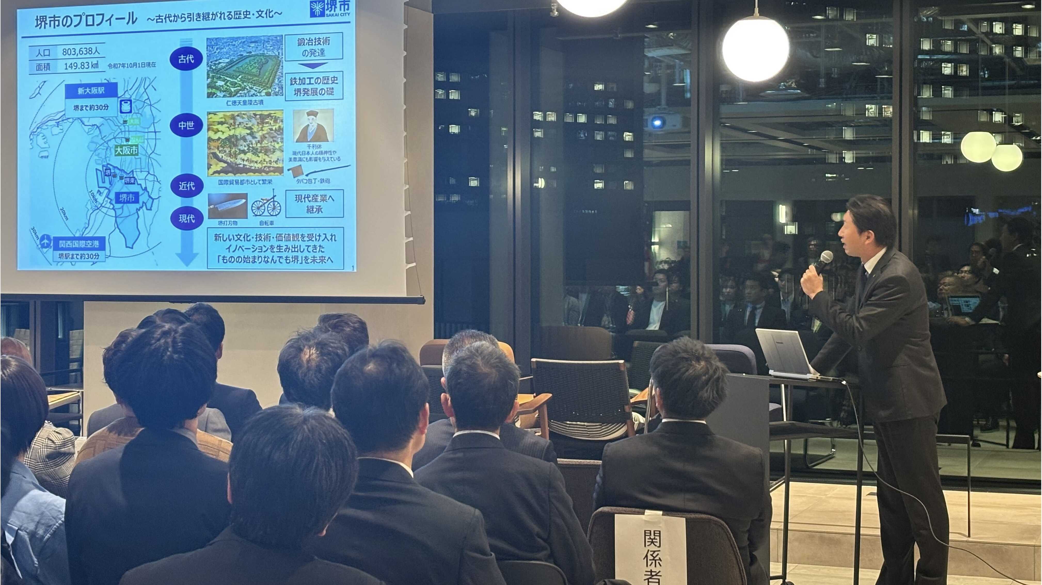 「本日は、東京・さかい交流会にお集まりいただきありがとうございます。私が市長に就任したのが2019年で、その直後から WeWork のような場所を活動拠点にしながら、東京で堺市の存在を示したいと考えておりました。WeWork に入居してからは、実際に入居されている自治体の方々に直接お話を聞いて、どのように活用できるかを思案し、職員も積極的に活動し、東京だけでなく大阪の御堂筋でもイベントを開催させていただくまでとなりました。