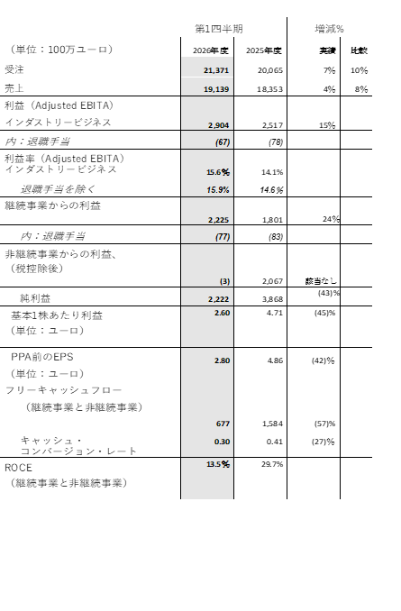 第1四半期の受注高は、為替換算およびポートフォリオ効果を除いた比較可能ベースで10%増加し、大半のインダストリー事業で2桁の増加を記録しました。比較可能ベースの売上高は8%増加し、すべてのインダストリー事業における成長が含まれます。