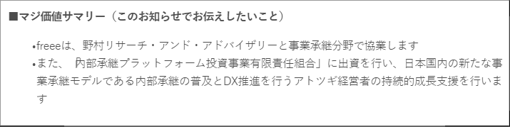 フリー株式会社(本社:東京都品川区、CEO:佐々木大輔、以下「freee」)は、野村リサーチ・アンド・アドバイザリー株式会社(本社:東京都千代田区、代表取締役社長:茂木豊、以下「野村リサーチ・アンド・アドバイザリー」)と事業承継分野において協業することとなりましたのでお知らせします。