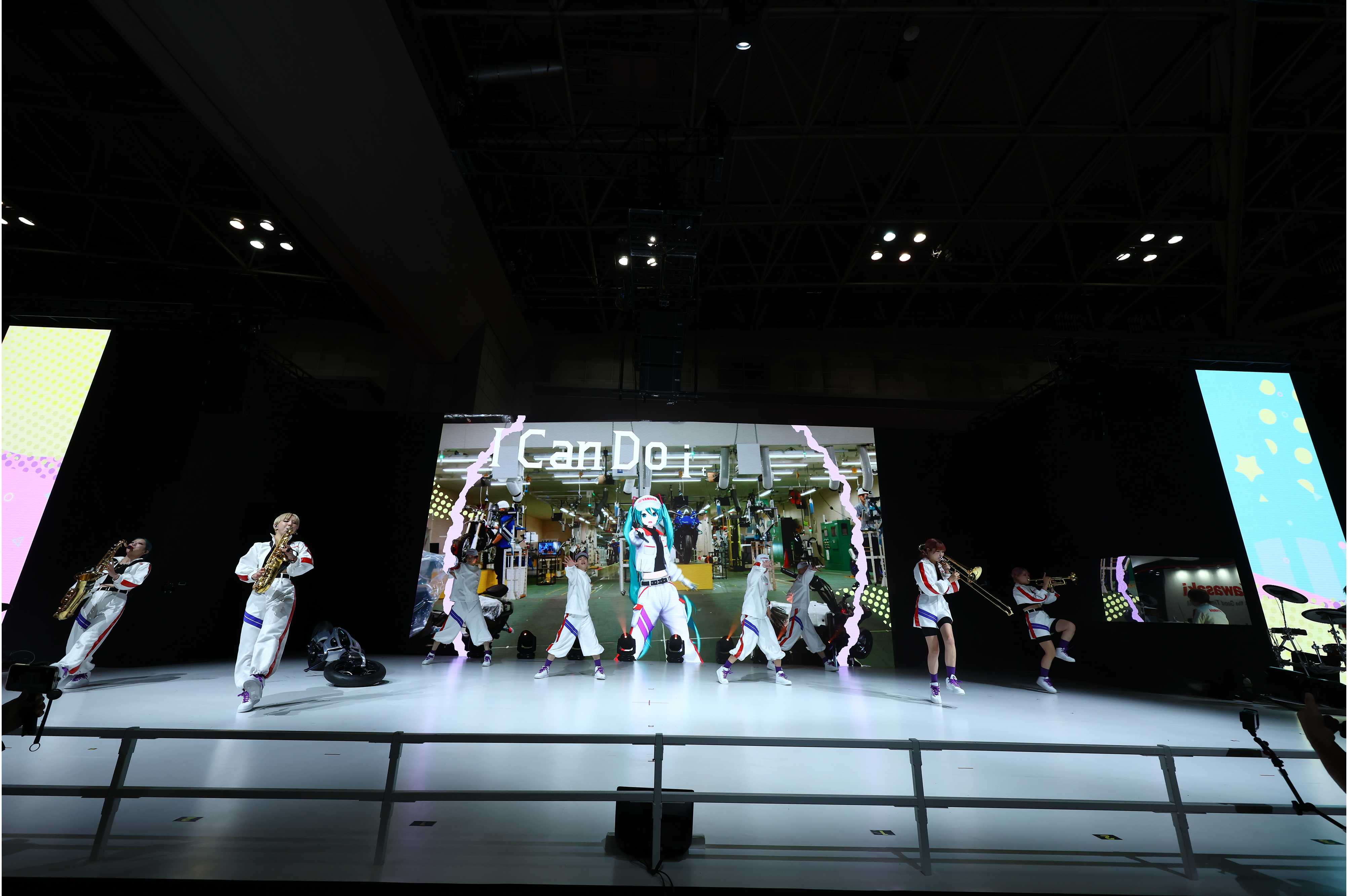 本作がお披露目されたメインメッセージショーは、ヤマハ発動機とヤマハ株式会社の工場を舞台にした臨場感あふれるイマーシブワンカット映像と、ヤマハ Sound xRによる高精細な音響演出が融合したステージ。さらに、ブラスダンスグループ“MOS”、ピアニスト、ドラマーによる迫力ある生演奏、そしてダンサーたちの躍動が重なり合い、最先端テクノロジーとライブパフォーマンスが一体となったエンターテインメントとして大きな話題を呼びました。また、ショーのフィナーレでは、初音ミクの代表曲「Tell Your World」のオーケストレーションとメッセージがシンクロし、会場全体を包み込むような感動を創出。観客一人ひとりが“感じて動きだす”瞬間を共有する、象徴的なクライマックスとなりました。