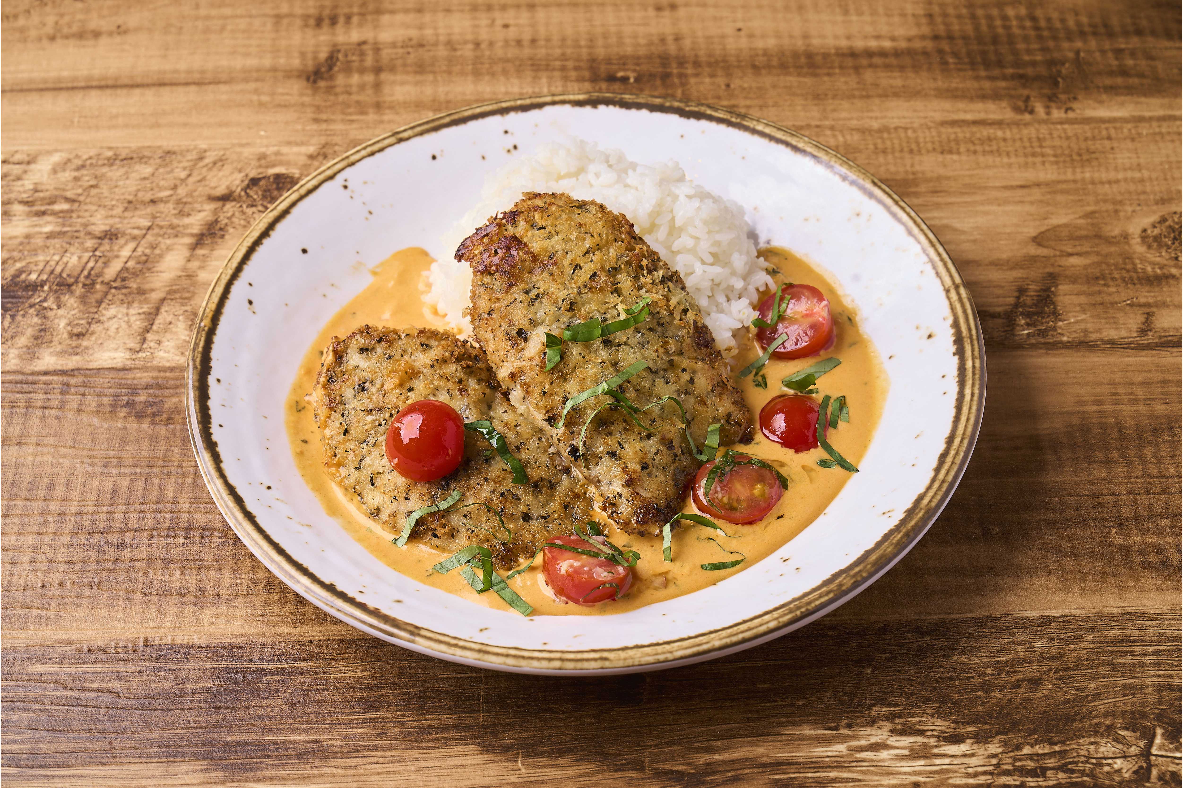 ハーブの香りとともにパン粉をまとわせ、カラッとフライした白身魚「マヒマヒ」(シイラ)を、軽い口当たりと爽やかな香りが楽しめるトマトバジルクリームソースで楽しむ一品。