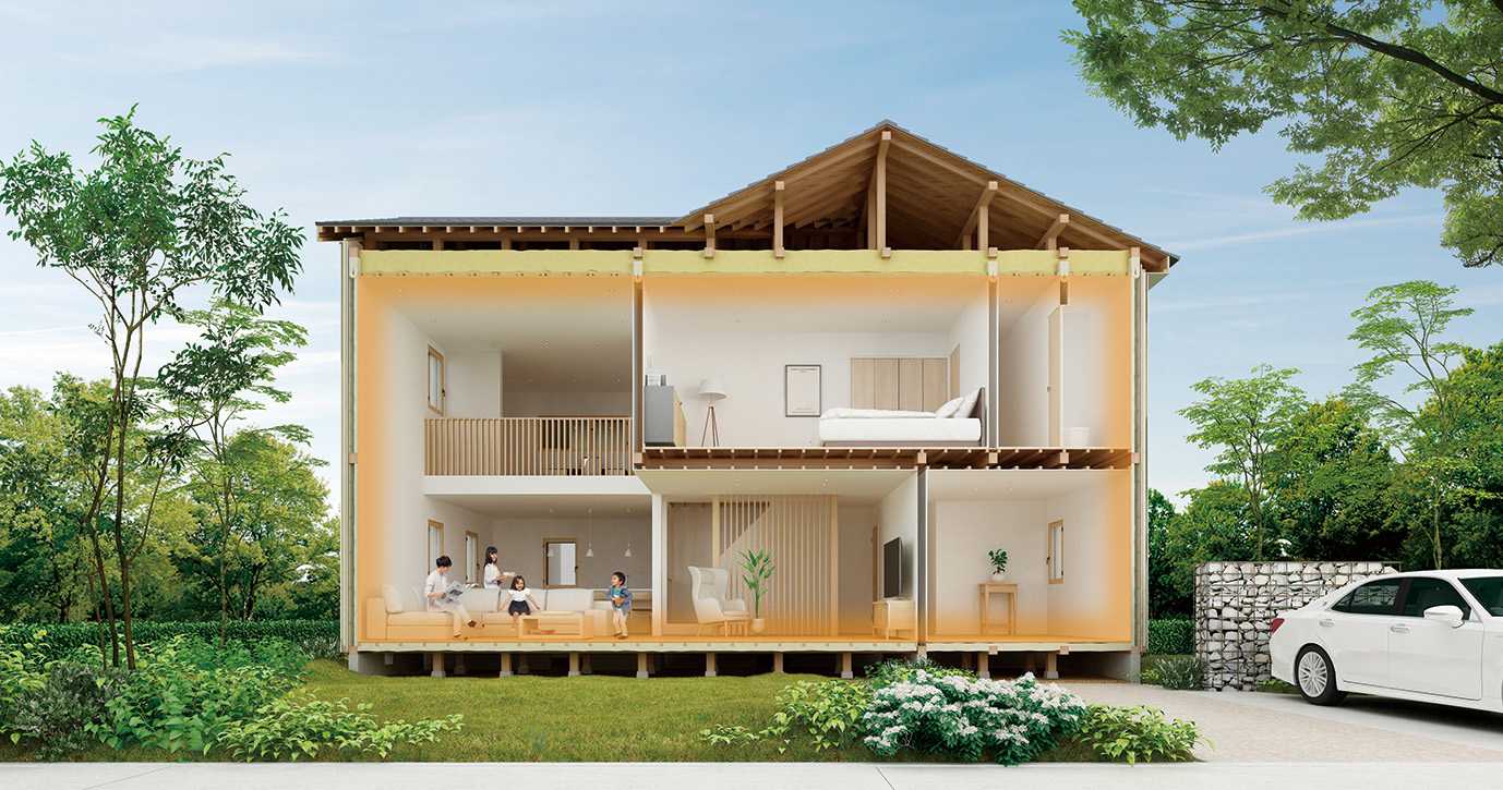 まるごと断熱リフォームは、今ある住まいを、一棟まるごと断熱改修することで高性能住宅化できる先進の工法。すぐれた性能の断熱材により、壁・天井・床をしっかり覆い、高断熱の窓や玄関ドアに交換。外気温の影響が少なく、快適・健康・省エネを実感できる暮らしを実現する。