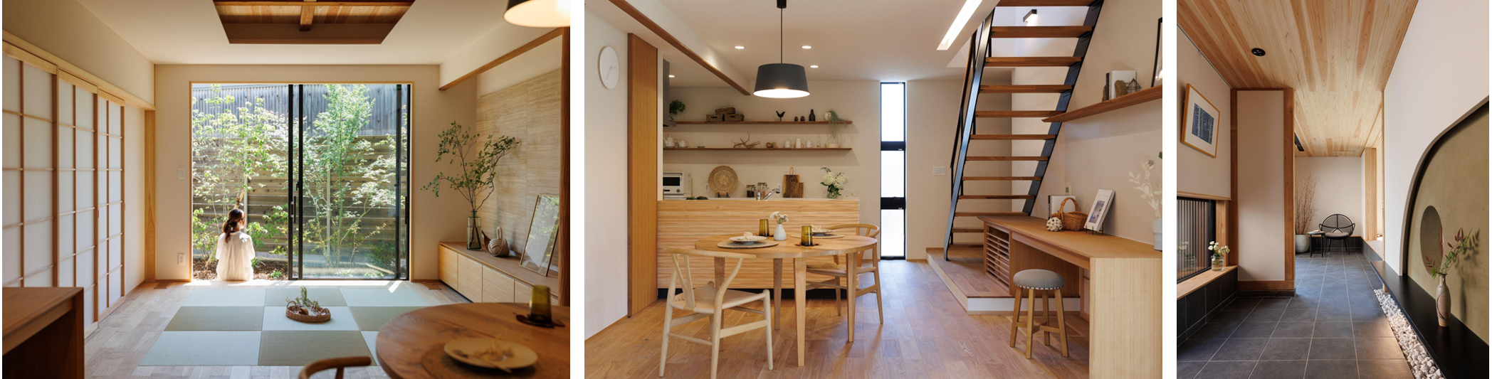 モデルハウスは、性能向上の体感はもちろんのこと、暮らしの空間としての素材・色調・ディテールにこだわった上質なしつらえ。大きな窓を介してLDKと中間領域の土間と外の眺望や庭など中と外とのつながり。和と北欧が融合したインテリア「ジャパンディスタイル」。それら要素の組み合せによって、心の豊かさを感じられる住まいを提案している。