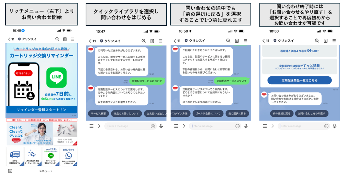この度、導入された公式LINEチャットボットは、LINEのトーク画面上で表示される選択肢(クイックリプライ)に沿って操作することで、浄水器やカートリッジ等に関してお客様が知りたいこと・目的に応じた情報にスムーズにアクセスできます。