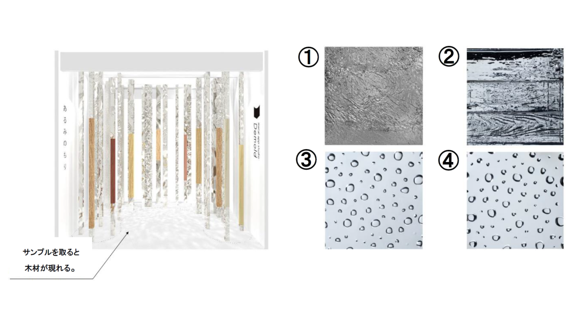 「あるみのもり」…金属の薄板に柄を転写した自在成形パネルを貼った角柱を並べ、森林を再現した展示。パネル表面の光反射が床面に投影され、木漏れ日のような自然な陰影を創出することで、森林の中を歩いているような臨場感を演出します。一部のパネルは取りはずして質感を確かめることができ、サンプルとしてお持ち帰りいただけるため、導入後のイメージをより具体的に感じていただけます。