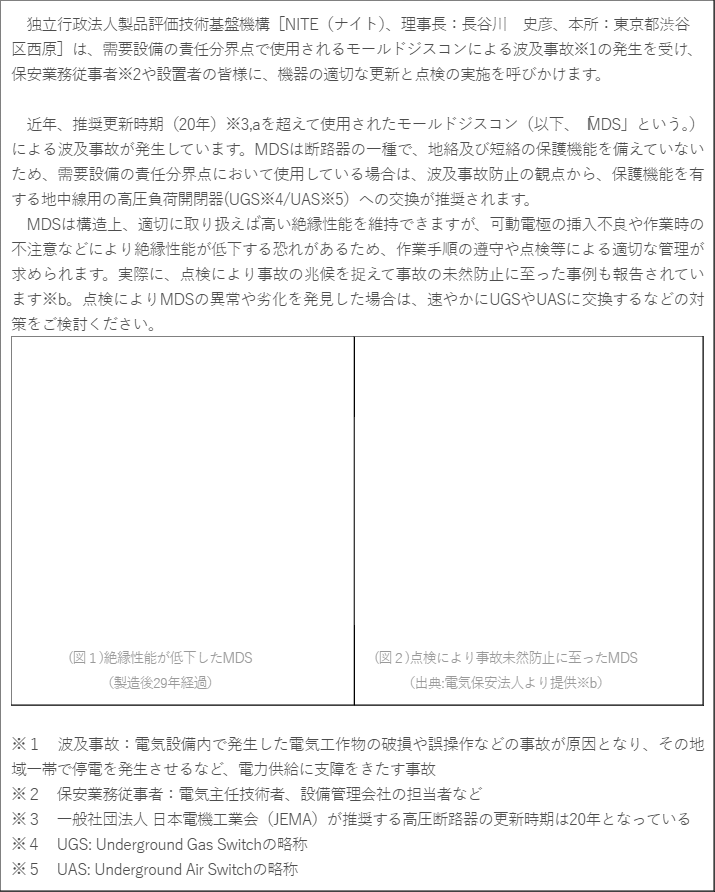 また、MDSによる波及事故のうち約3割については、月次・年次点検で絶縁性能の低下といった事故の予兆を把握できていた事例であることから、特に推奨更新時期を超えて使用されたMDSにおいては、点検等による適切な管理が求められます。「2.モールドジスコン(MDS)における点検のポイント」に、点検のポイントをまとめているので、点検にご活用ください。点検によりMDSの異常や劣化を発見した場合は、速やかにUGSやUASなどに交換するといった対策をご検討ください。