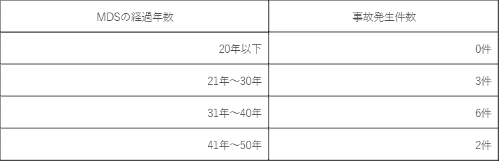 (表2)MDSによる波及事故発生時におけるMDSの経過年数と事故件数