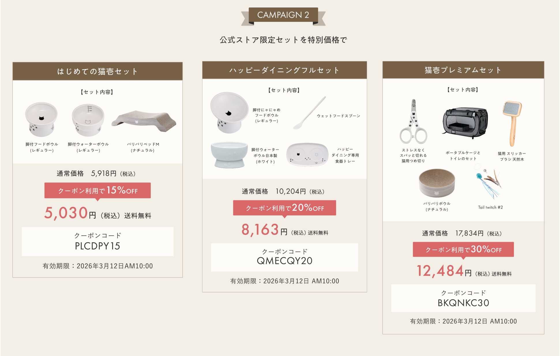 キャンペーン期間中は、各セットにご利用いただける特別クーポンもご用意しております。