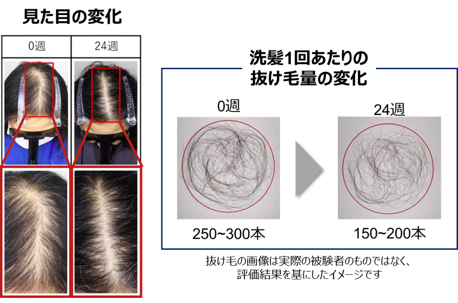 また、全12例の中で、最も総毛髪数の変化量が大きかった下記の症例では、24週間で総毛髪数が24.3本/cm2増加しました。なお、本症例においては、併せて評価している「洗髪1回あたりの抜け毛量」が、試験開始時(0週)では250~300本だったのに対し、24週では150~200本であり、24週間で約50~150本程度の減少が認められました(図4)。