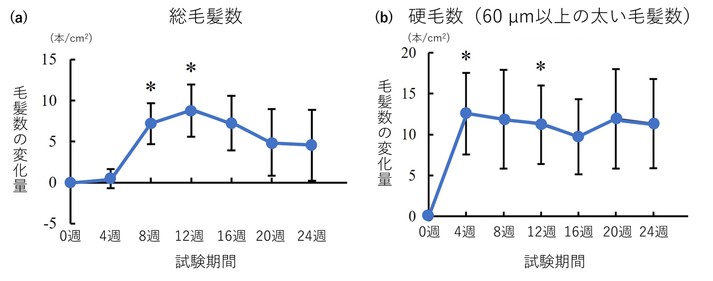n=10-12. 平均値±標準誤差 (*p < 0.05; 対応のあるt検定). 治療開始時(0週)から24週後まで4週毎に、評価部位1cm2あたりの毛髪数を測定した.
