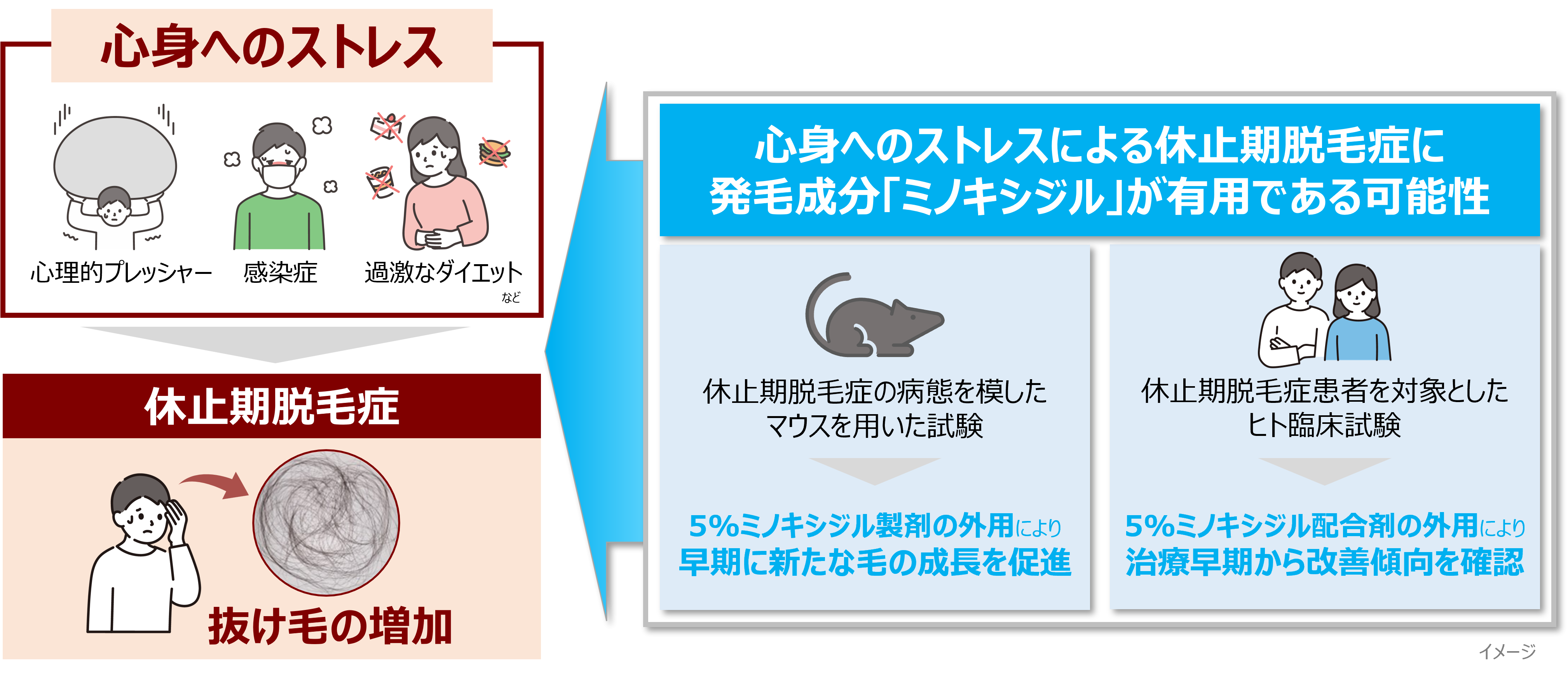 発毛成分「ミノキシジル」は、毛髪を休止期から成長期※2に移行させる作用が知られており、一般的には壮年性脱毛症の治療に用いられます。こうした作用から、休止期脱毛症の回復を早めることが期待されますが、これまで休止期脱毛症に対する十分な検討は行われていませんでした。