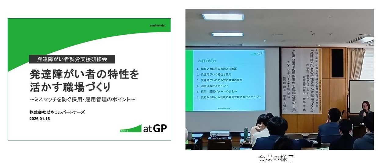 障害者の就労支援を中心にソーシャルビジネスを展開する株式会社ゼネラルパートナーズ(本社:東京都千代田区、代表取締役社長:進藤均)は、2026年1月16日(金)に、松山市社会福祉協議会主催の「令和7年度松山市発達障がい者就労支援研修会」に登壇しました。