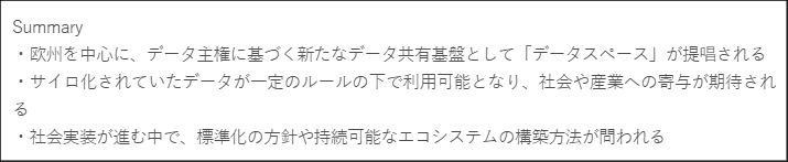 データスペースは中小企業にとって、新たなビジネス参入の機会を広げる基盤となります。これまでアクセスが難しかった産業データを一定のルールの下で活用できるようになれば、規模に依存しない競争が可能になります。一方で大企業にとっても、サプライチェーン全体の最適化や外部企業との協創を通じたイノベーション創出につながり、エコシステム全体の価値向上が期待されます。このように、データスペースは単なる「データ共有の仕組み」ではなく、競争環境そのものを再設計する基盤と捉えることもできます。