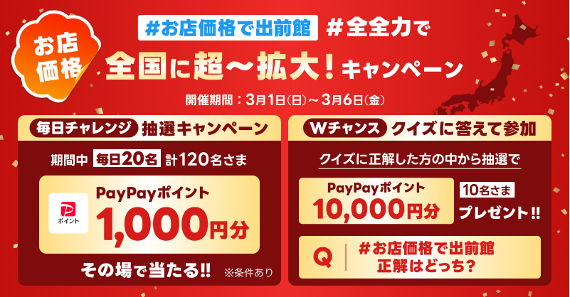 期間中毎日チャレンジでき、その場でPayPayポイントが当たるキャンペーンを出前館公式Xアカウントにて実施いたします。