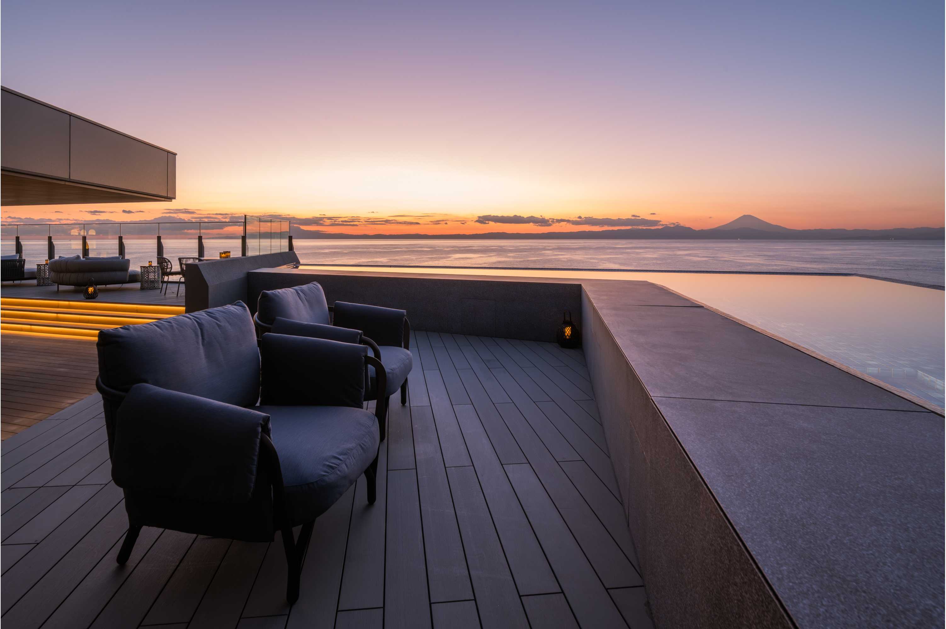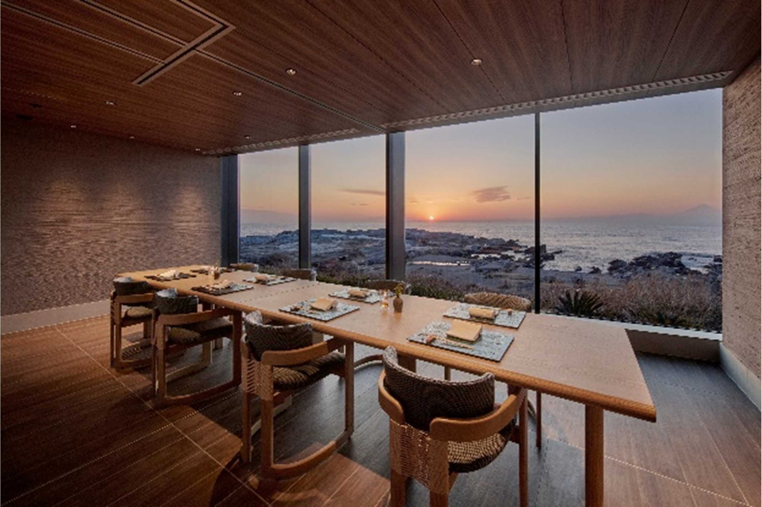 壮大な自然に恵まれた城ヶ島の環境を最大限に活かし、34室の全客室から海を望む贅沢な設えが本施設 最大の特徴です。海の向こうに浮かぶ富士山と夕陽の絶景、潮風を感じる客室温泉、海の幸をふんだんに活かしたお料理をお愉しみいただけます。