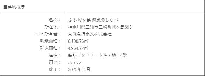 ヒューリックと京急電鉄、三浦市が協力して国家戦略特区認定を取得し、観光地としての発展・活性化を図る ための三浦市地区計画決定を経て、この度施設の完成を迎えました。