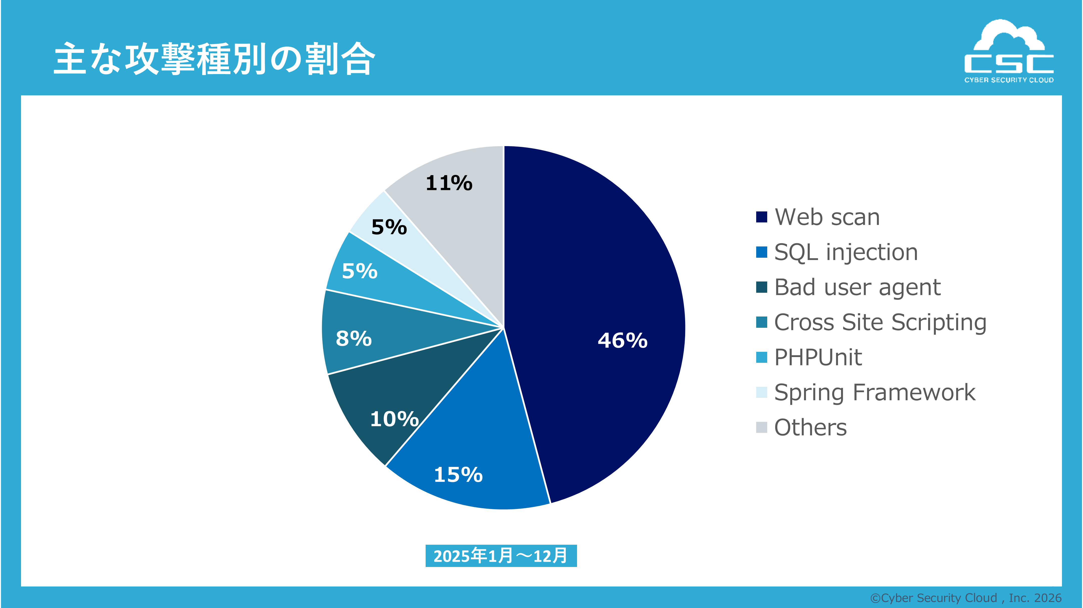 グローバルセキュリティメーカーの株式会社サイバーセキュリティクラウド(本社:東京都品川区、代表取締役社長 兼 CEO:小池 敏弘、以下「当社」)は、2025年1月1日~12月31日を対象とした『Webアプリケーションへのサイバー攻撃検知レポート(以下「本レポート」)』を発表します。本レポートは、当社が提供するWebアプリケーションへのサイバー攻撃を可視化・遮断するクラウド型WAFの『攻撃遮断くん』、及びパブリッククラウドWAFの自動運用サービス『WafCharm(ワフチャーム)』で観測したサイバー攻撃ログを集約し、分析・算出しています。
