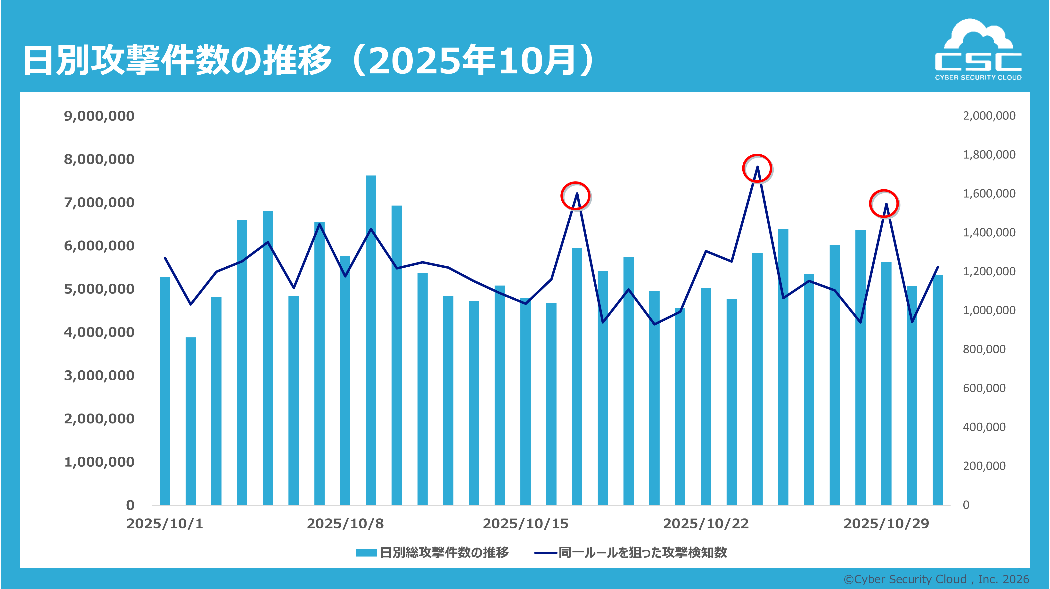 特に10月には、日別総攻撃件数がおおむね500万件前後で推移する中、特定日において単一ルールを対象とした検知数が急増する事象が確認されました。