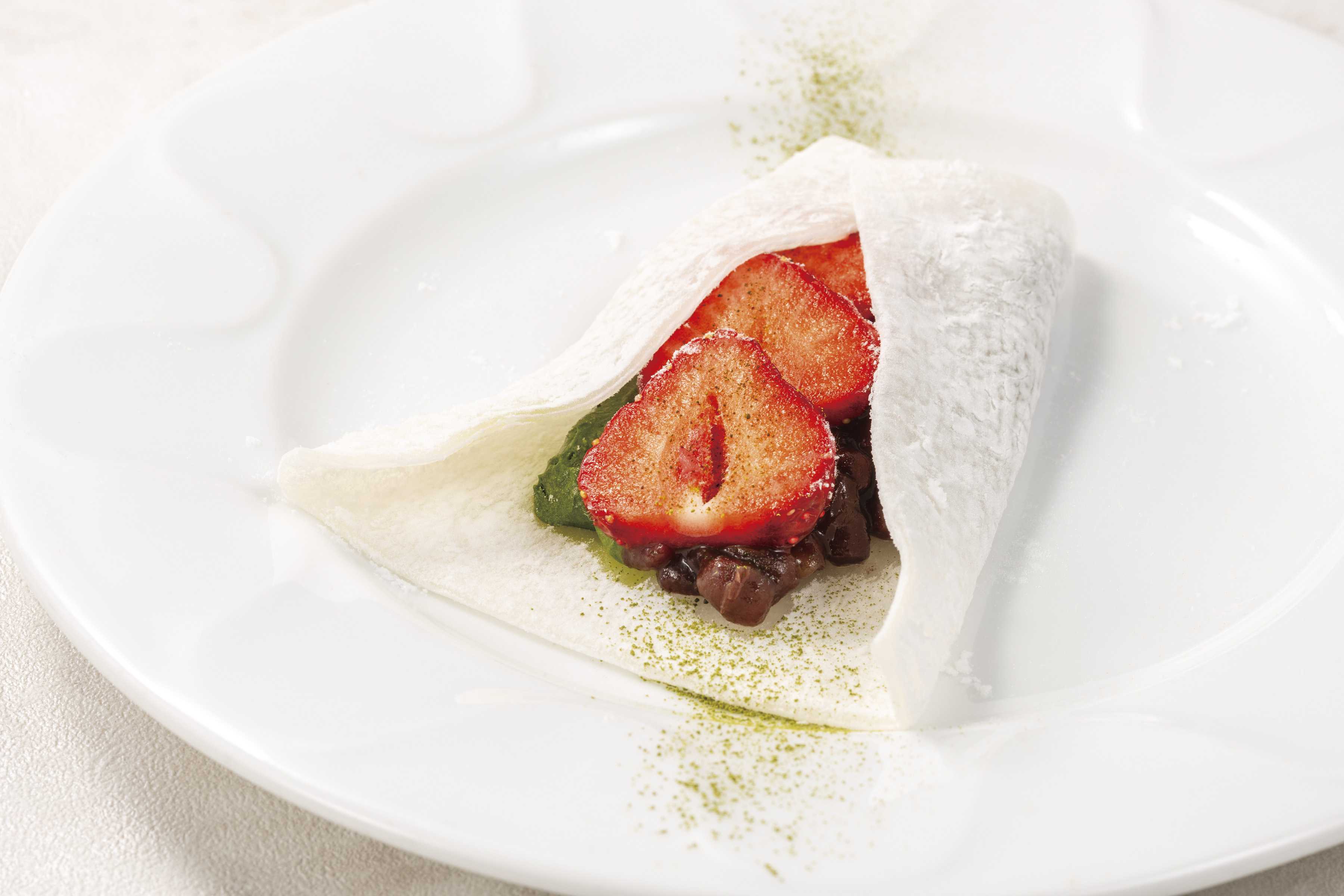 そのまま味わうのはもちろん、お客さまご自身でくるりと包んでいただくことが楽しい、もちもち食感のデザート。フレッシュないちごを、まろやかで濃厚な宇治抹茶クリームとゆであずきが、いちごの爽やかな味わいを引き立てます。ジューシーないちごの香りと甘さが口いっぱいに広がる、和洋折衷のスイーツをお楽しみください。