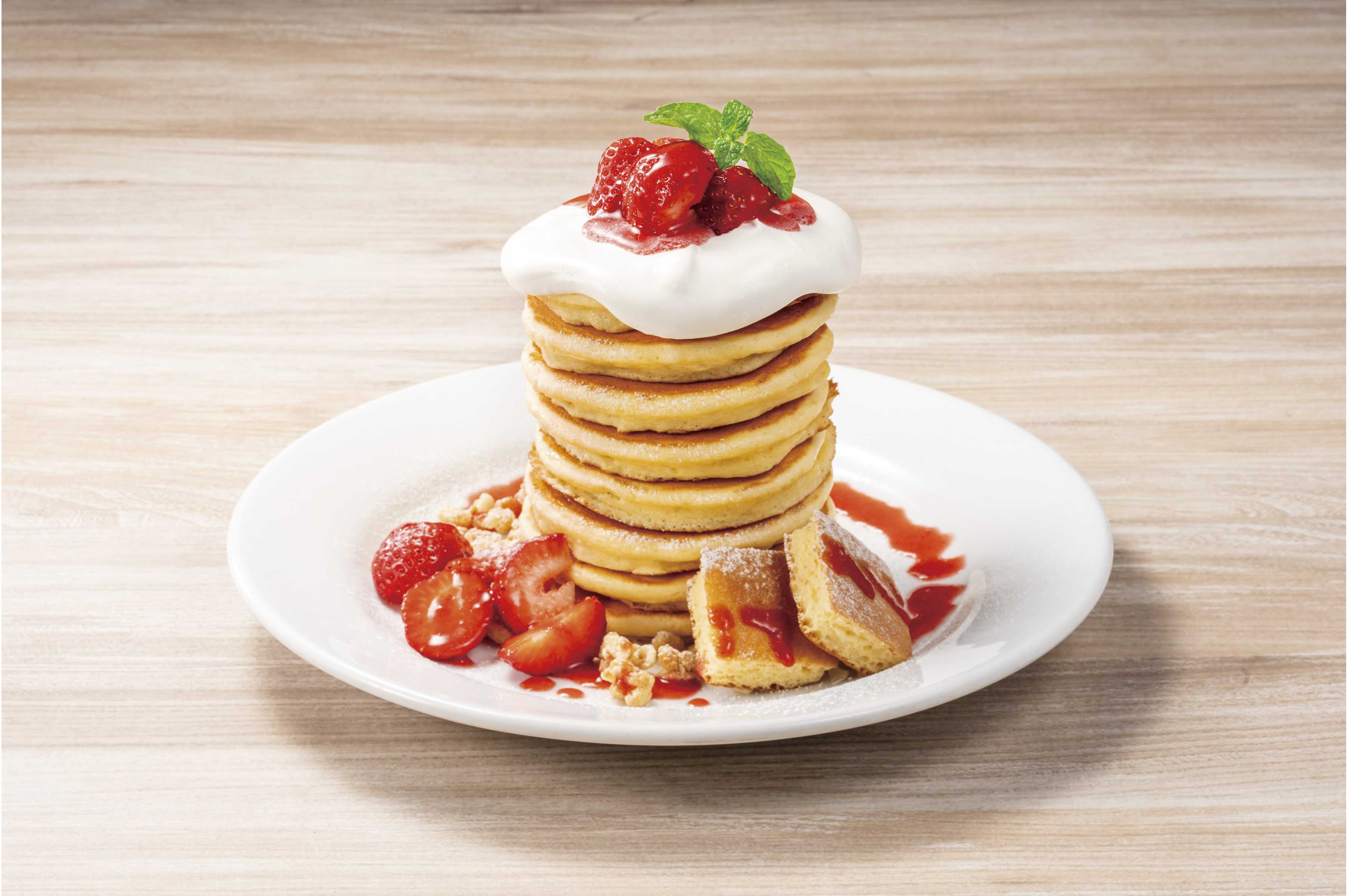 ふんわりとしたパンケーキを、タワーのように積み上げたスペシャルなデザート! デニーズで人気のパンケーキを8枚重ねた、ボリューム満点の一皿です。トッピングは、フレッシュないちごを贅沢に♪ ふわふわのホイップやフルーティないちごソースを合わせて、見た目も華やかに仕上げました。甘い香りが口いっぱいに広がる、夢見るようなひとときをお楽しみください。