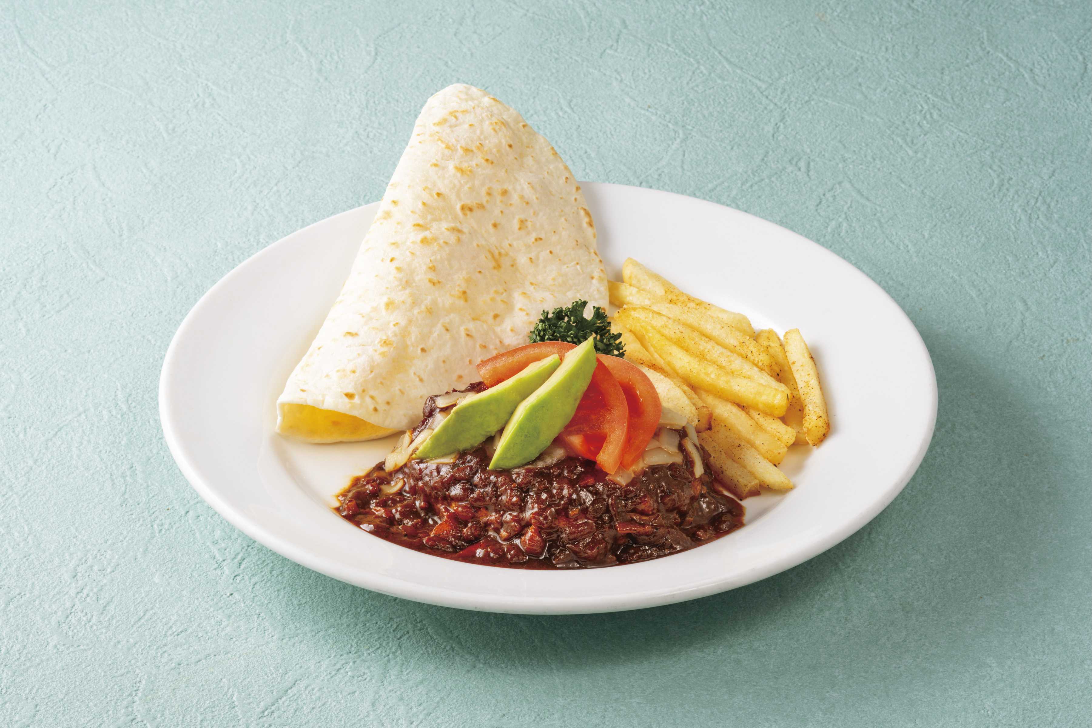 タコスをイメージした体験型メニュー。お客様ご自身でトルティーヤにソースやハンバーグ、アボカドなどを包んでお召し上がりいただけます。