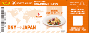 さらに、期間中に対象のハンバーグメニューをご注文いただいたお客様には、人気アニメのキャラクターを担当する声優の江口拓也さん、早見沙織さんが本フェアのためだけに録り下ろした、オリジナル音声コンテンツが楽しめる「特別チケット」をプレゼントします。チケットは「搭乗券」を模したデザインとなっており、記載された二次元コードを読み込むことで、お二人がガイドするそのハンバーグの魅力や、まるで旅に出ているかのような限定ボイスをお楽しみいただくことができ、視覚・味覚・聴覚で楽しむ、デニーズならではの「没入型ハンバーグ体験」を提供いたします。