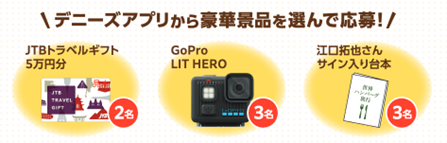 期間中、デニーズアプリにご登録の上、対象のハンバーグメニューを3回以上ご注文・ご応募いただいた方の中から、抽選で合計8名様に豪華景品をプレゼントいたします。