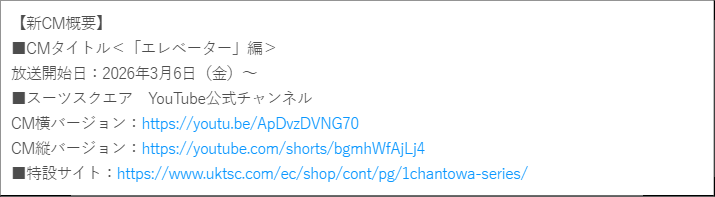 スーツスクエアのアンバサダーであり、女優やモデルとして活躍している白石麻衣さんが、どんな時でも「ちゃんとは、したい」という気持ちを表したCMをWeb限定で公開。エレベーターの扉が開く度に驚き、手に持っていた資料をばらまいてしまう白石さん。本CMでは、『CHANTOWA』シリーズを着ていることで、さまざまな場面や表情でも不思議とちゃんとは見えることを表現しています。