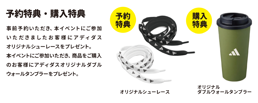 アディダス専用計測器にて足型を計測し、お客様の足に最適なシューズをご提案する相談会を開催。事前にご予約いただいたお客様には「アディダスオリジナルシューレース」を、さらに商品をご購入のお客様には「アディダスオリジナルダブルウォールタンブラー」をプレゼントいたします。今からランニングを始めようか検討している方から、今お使いのシューズでお悩みの方まで、お気軽にご参加いただけます。