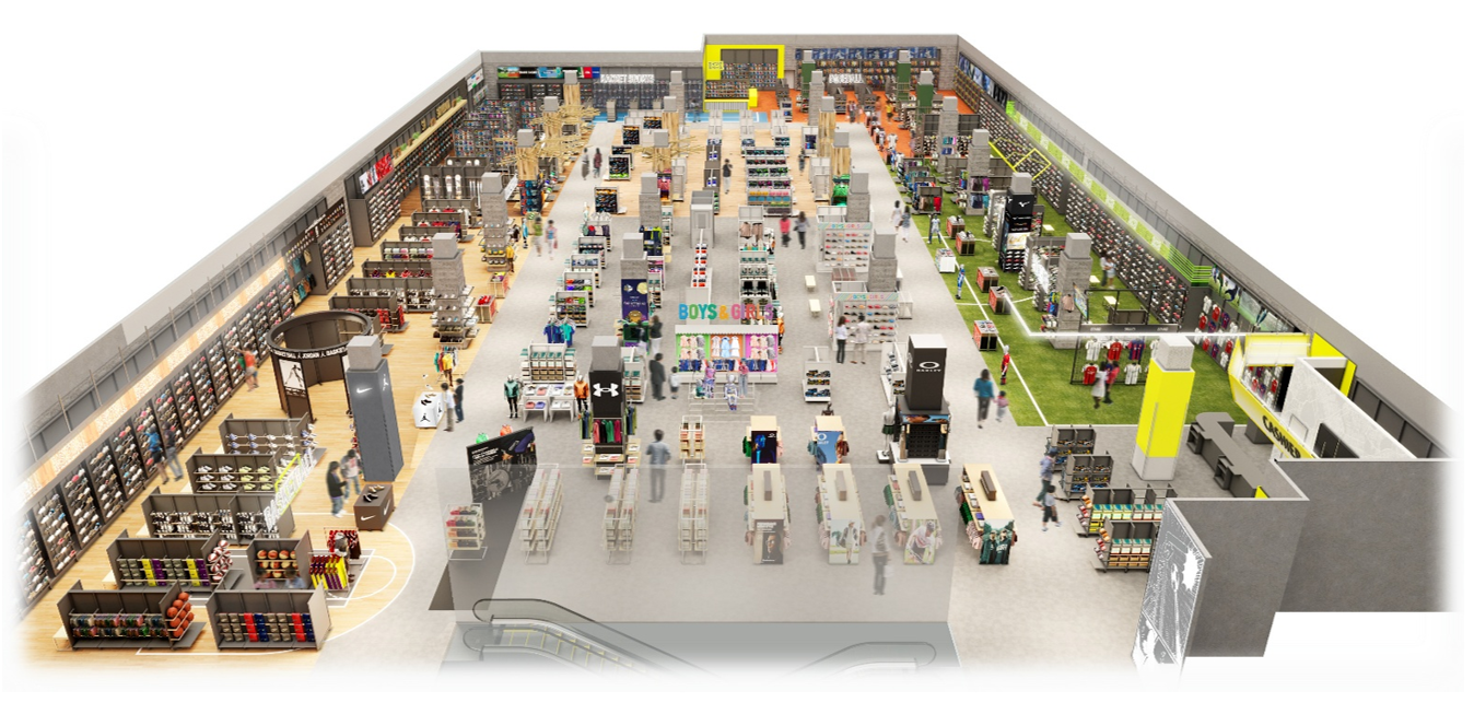 売場面積約1,500坪を誇る北海道エリア最大級の体験型店舗として、日常に溶け込むランニング・フィットネス・アパレルから、プロ仕様の野球・サッカー・バスケットボール等の専門競技アイテムまで、圧倒的なスケールで展開。