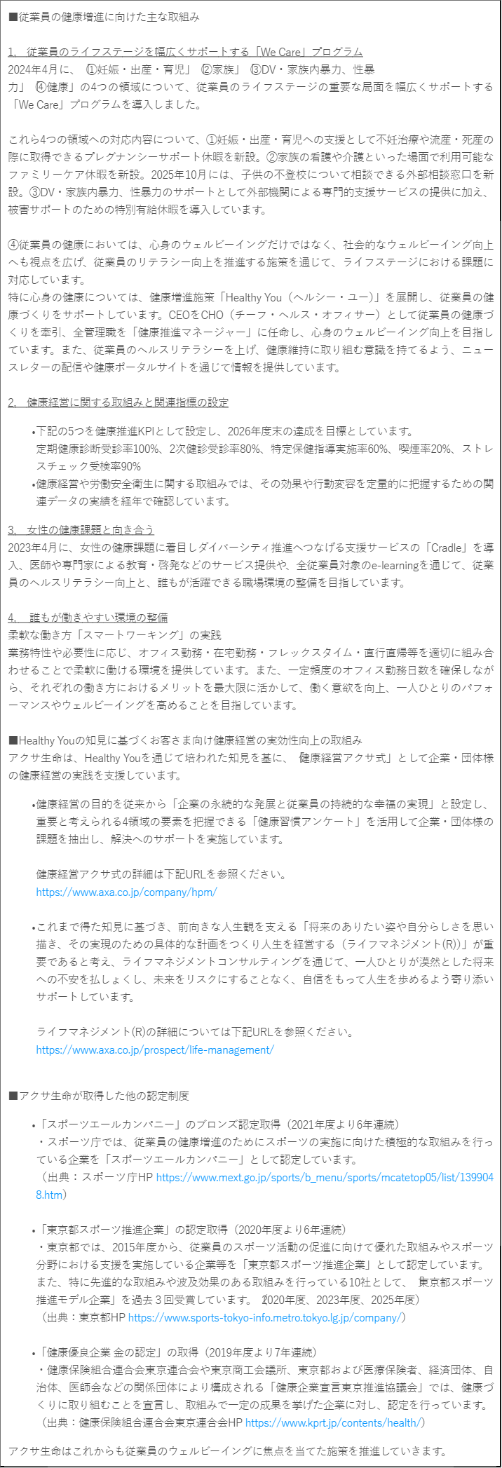 アクサ生命は、「すべての人々のより良い未来のために。私たちはみなさんの大切なものを守ります。」というアクサのパーパス(存在意義)を体現するために、責任ある企業として、今後も健康経営を重要な施策と位置づけ、模範的な企業となるべく自社の取組みを強化するとともに、地域社会にアクサならではの価値を提供する社会啓発を行っていきます。