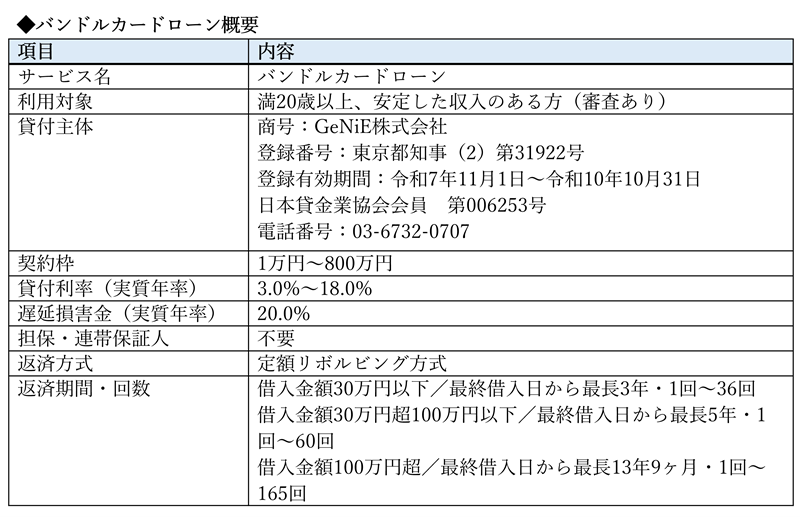第1弾の取り組みとして、GeNiE株式会社(東京都中央区、代表取締役社長: 齊藤 雄一郎 、以下「GeNiE」)との提携により、同社を貸付主体とする個人向けローンサービス「バンドルカードローン」の取り扱いを開始します。