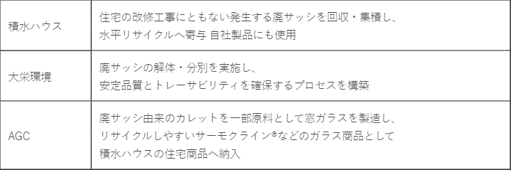 積水ハウス株式会社(社長:仲井 嘉浩、以下「積水ハウス」)、大栄環境株式会社(社長:金子 文雄、以下「大栄環境」)、AGC株式会社(社長:平井 良典、以下「AGC」)の3社は、住宅*1の改修工事に伴い発生する廃サッシから窓ガラスを回収し、元の窓ガラスと同等品質の窓ガラスへ再生する水平リサイクルの実証実験を2026年3月より関西圏で開始します。ハウスメーカー・リサイクラー・ガラスメーカーが連携して窓ガラスを水平リサイクルする循環型モデルは国内初です。