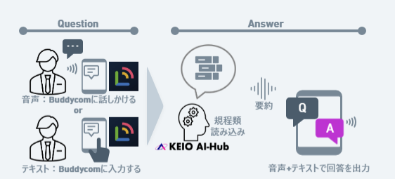 本機能は、当社の各種規程類を参照させた「KEIO AI-Hub」と乗務員や指令員等が使用する「Buddycom」アプリをAPI連携させたもので、ユーザーが「Buddycom」を通じて音声またはテキストで質問を入力すると、「KEIO AI-Hub」が社内マニュアル等のデータベースを検索・要約し、「Buddycom」上で読み上げ・チャットで回答します。
