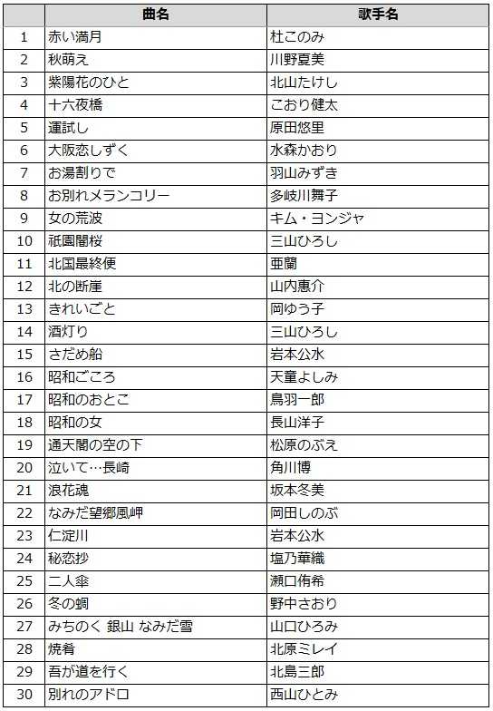 演歌・歌謡曲部門 エントリー楽曲リスト(30曲)