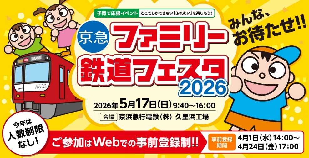 京浜急行電鉄株式会社(本社:横浜市西区,取締役社長:川俣 幸宏,以下京急電鉄)は,2026年5月17日(日)に,京急電鉄久里浜工場(所在地:神奈川県横須賀市)において,「京急ファミリー鉄道フェスタ2026」を開催いたします。