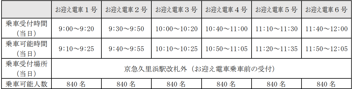 会場から京急久里浜駅にお帰りの際は,以下のとおり運行いたしますお帰り電車をご利用ください。京急ファミリー鉄道フェスタにご来場いただいた方はどなたでもご乗車いただけます。