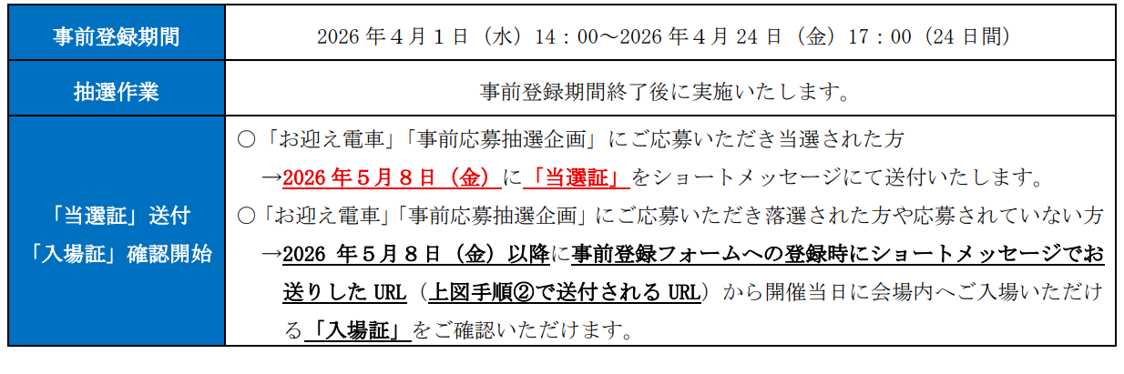 ・抽選作業終了後,2026年5月8日(金)に「お迎え電車」・「事前応募抽選企画」にご応募いただき当選された方には「当選証」をショートメッセージにて送付いたします。