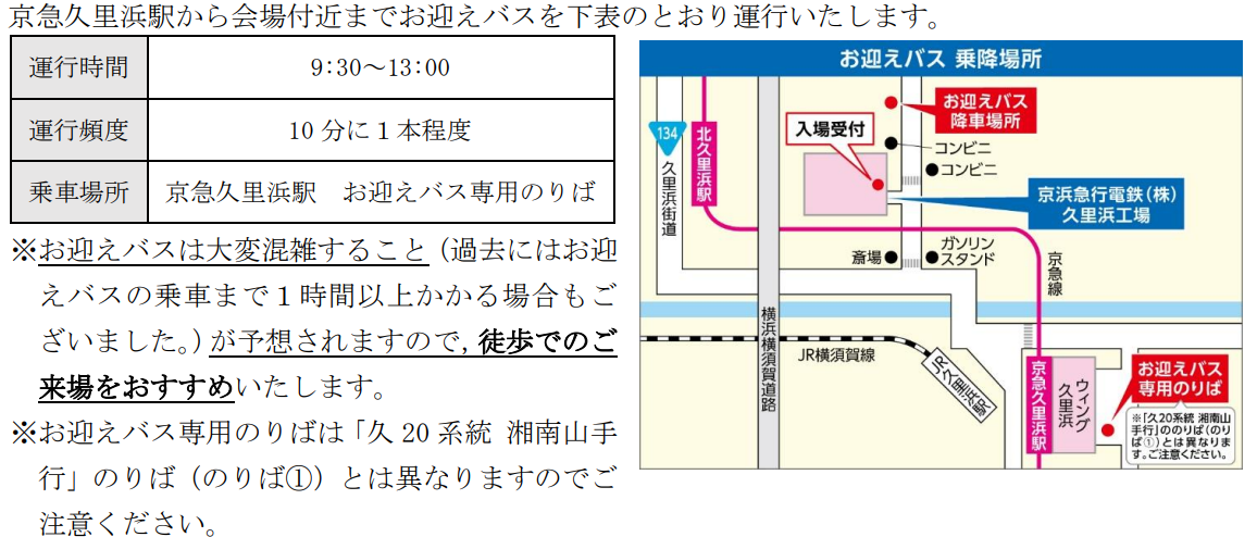 ・開場は9:40ですが,当日9:15から久里浜工場敷地内の開場待機スペースにご案内します。当日9:15より前に久里浜工場入口周辺(久里浜工場敷地外)にてお並びいただくことは近隣住民の方々や地域へのご迷惑となりますのでおやめください。また開場より前にお待ちいただいても,お待ちいただいた方から順番にご案内することを保証するものではございませんので,あらかじめご了承ください。