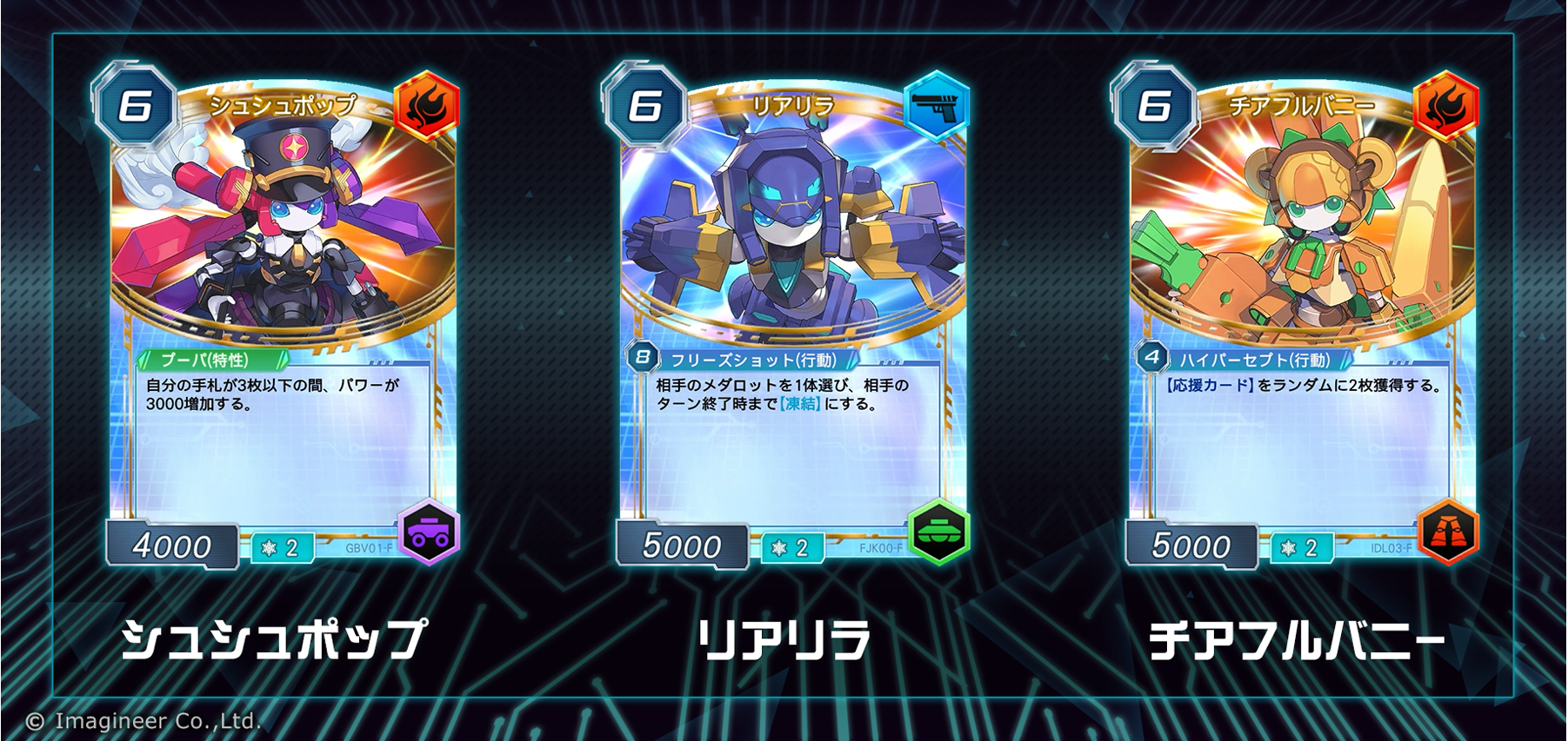 シュシュポップ、リアリラ、チアフルバニー(デザイン担当:神藤かみち氏)の3体が、ゲーム内に登場するメダカードファイターのデッキでリーダーメダロットとして活躍。